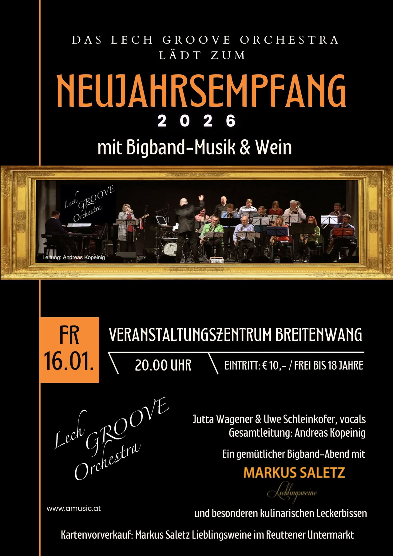 Kartenvorverkauf: Markus Saletz Lieblingsweine im Reuttener Untermarkt, am Klavier- und Jazzinstitut in Reutte und bei den Musiker*nnen des Lech Groove Orchestra